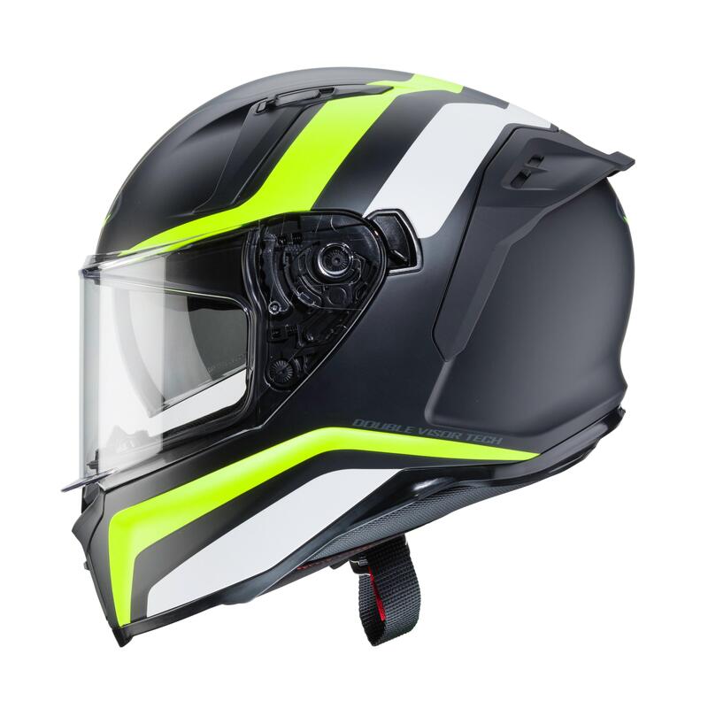 The AVALON is equipped with an anti-scratch clear visor predisposed for the insertion of the anti-fog lens, and an integrated sunshade visor DVT (Double Visor Tech) easily maneuverable with a lateral lever. Both visors can be easily removed without the use of tools.