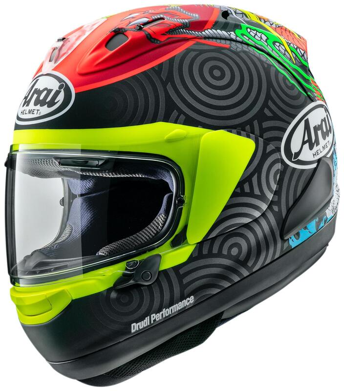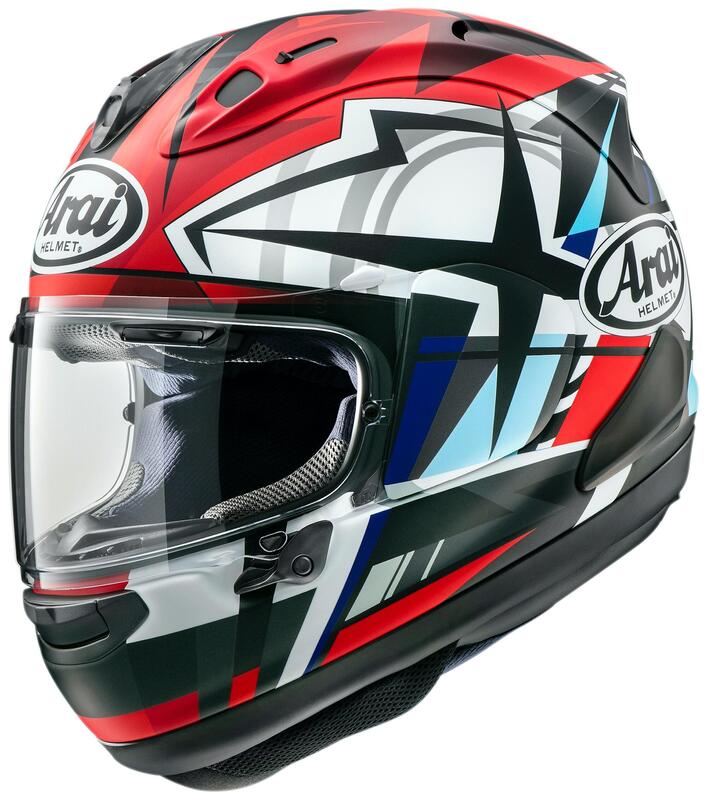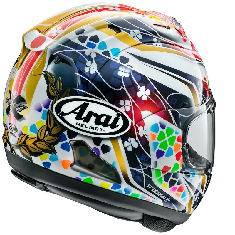 The new RX-7V Racing is available in the single-color versions (at 959 euros) and in the American Eagle or Tatsuki Suzuki, Takumi Takahashi, Ryuichi Kiyonari, Takaaki Nakagami replica graphics, which you see below, for 1,139 euros. The new replica colors will also be available on the standard Arai RX-7V.