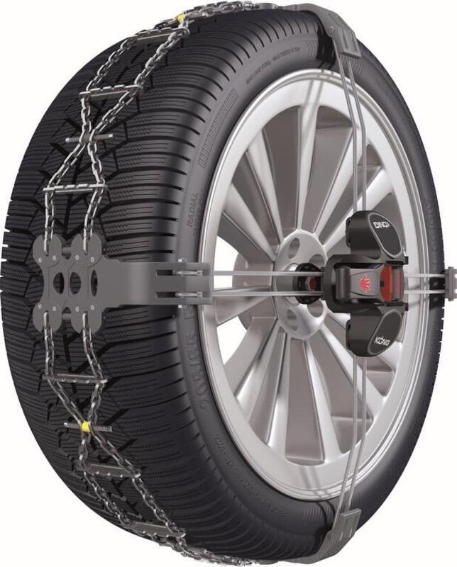 König's K-Summit chains have 0 mm internal footprint and are fixed to one of the original rim nuts (not the anti-theft one) with a ratchet locking system.