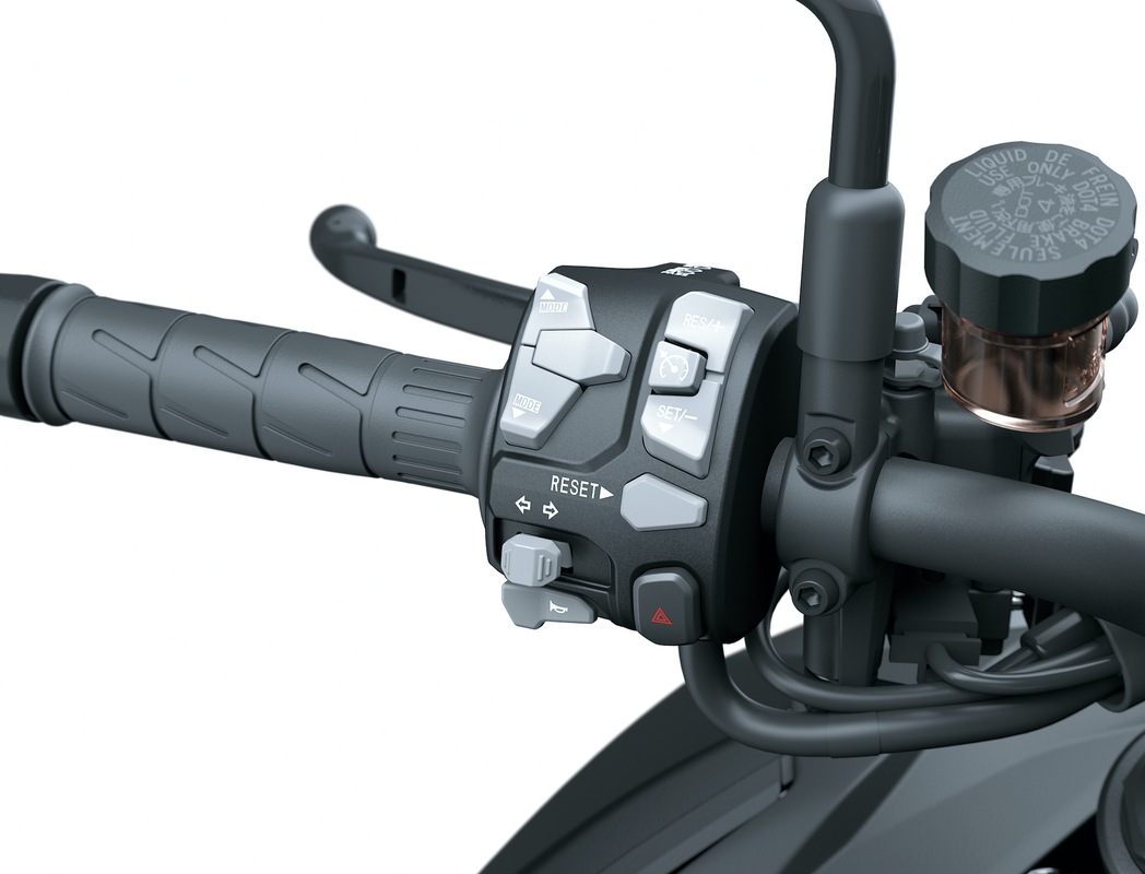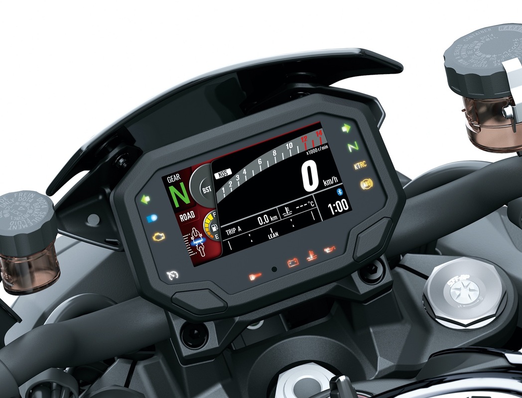 The Z-H2 offers four Riding Modes (Sport, Road, Rain and Rider, which is customizable), cruise control, a two-way quickshifter and Launch control. The inertial platform supervises the 3-level KTRC traction control and the KCMF (Kawasaki Cornering Management Function) which manages braking power and torque delivery when cornering. Braking relies on the well-known KIBS derived from the hyper sports ZX-10R, that is the intelligent cornering ABS system.