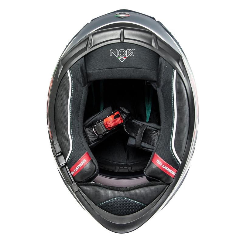 The quality level is high, especially considering the final price. The inner liner is hand-sewn, and just like high-end helmets, it’s completely removable, washable and customizable; the cheek pads are equipped with an emergency strap to allow the removal of the helmet without causing injuries to the neck in the event of a crash. The modular chin strap is also removable, and an increased housing is already provided for the speakers of intercom systems.
