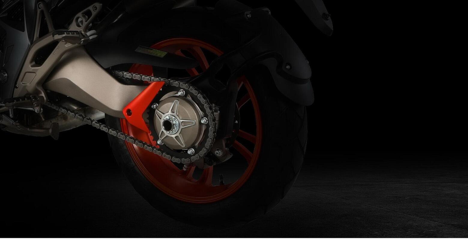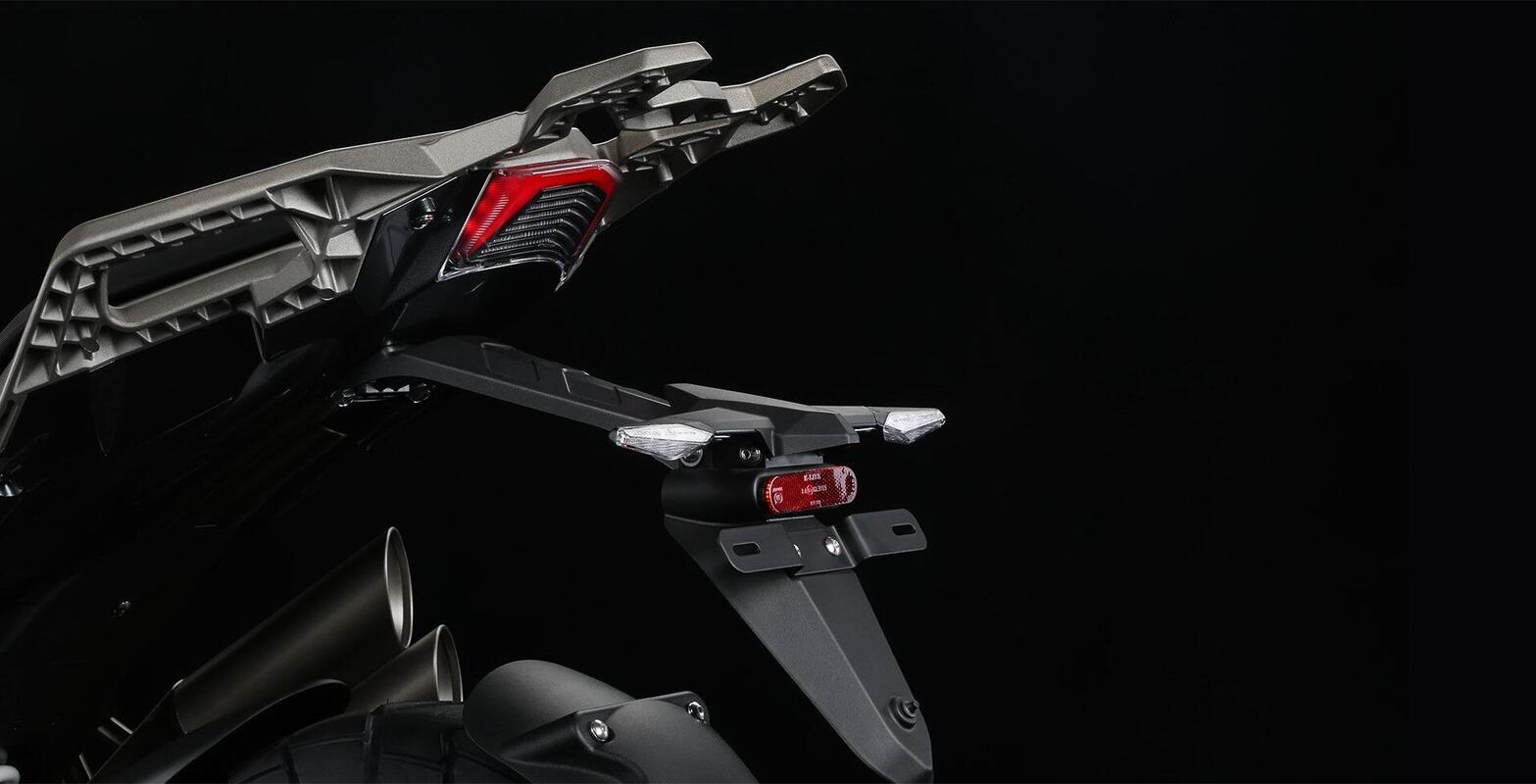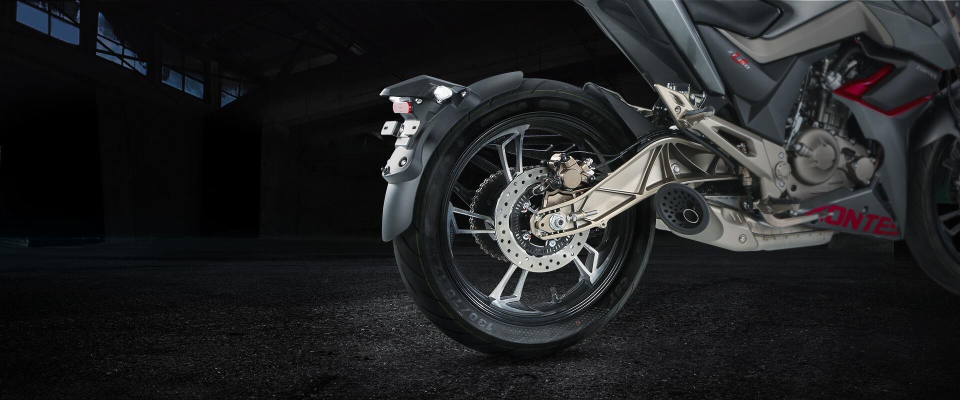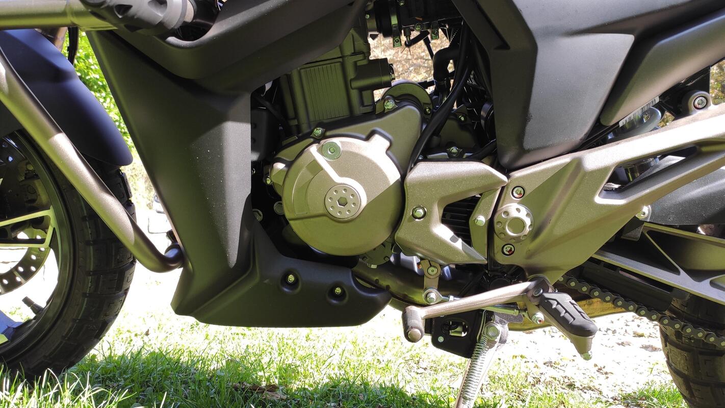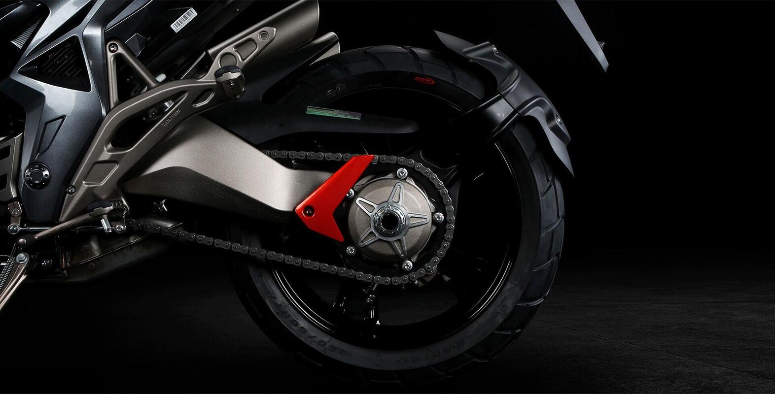 The frame is made of high-strength steel coupled to an aluminum alloy swingarm. The alloy wheels are 17-inch with hollow interior, and house knobby tires 110 / 70-17 at the front and 130 / 70-17 at the rear.
