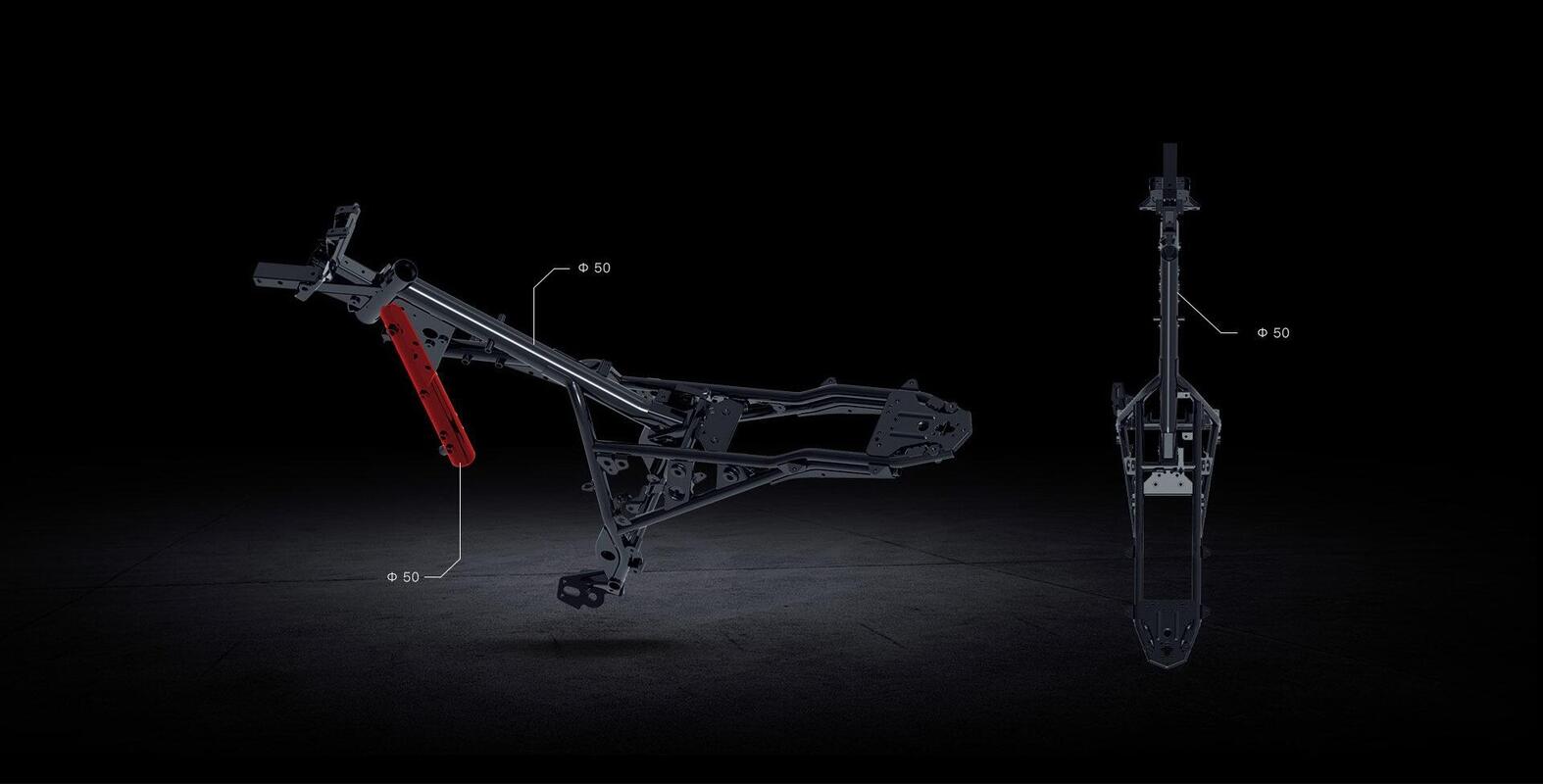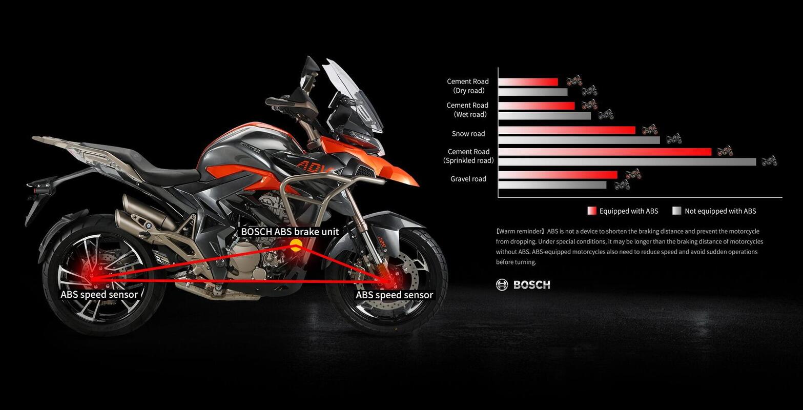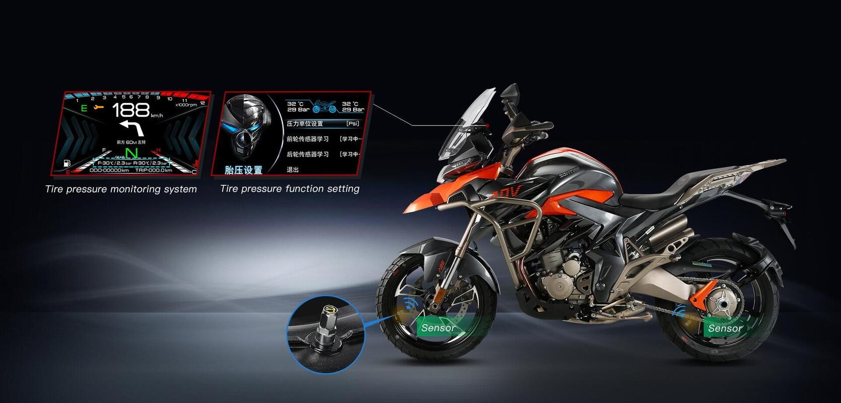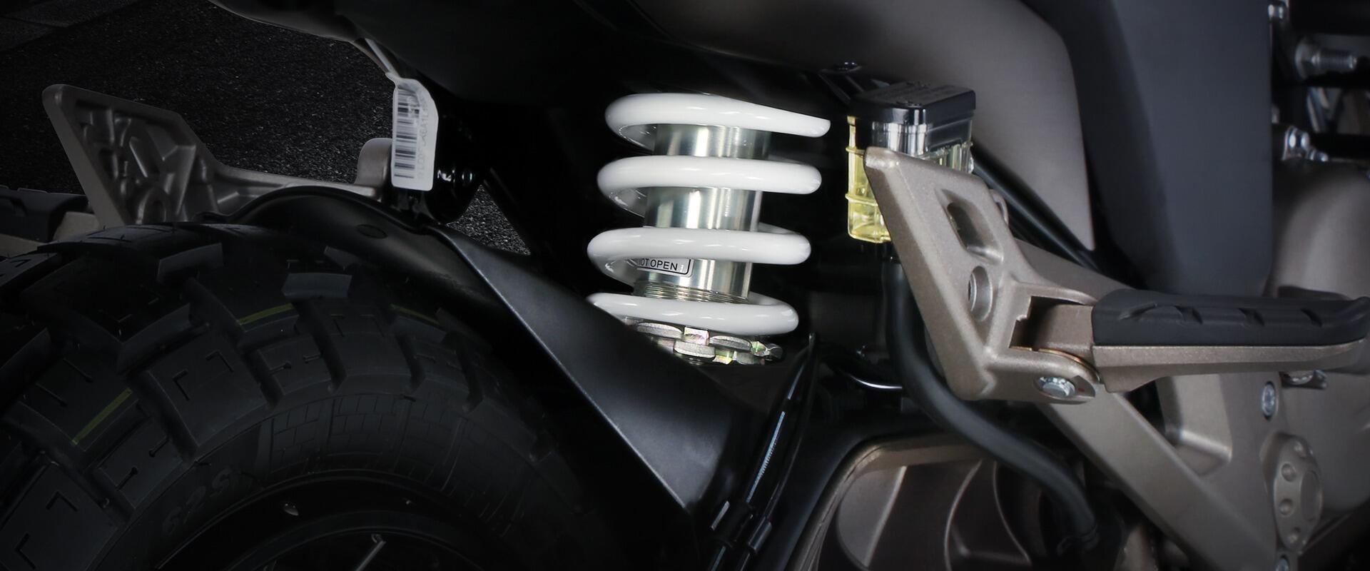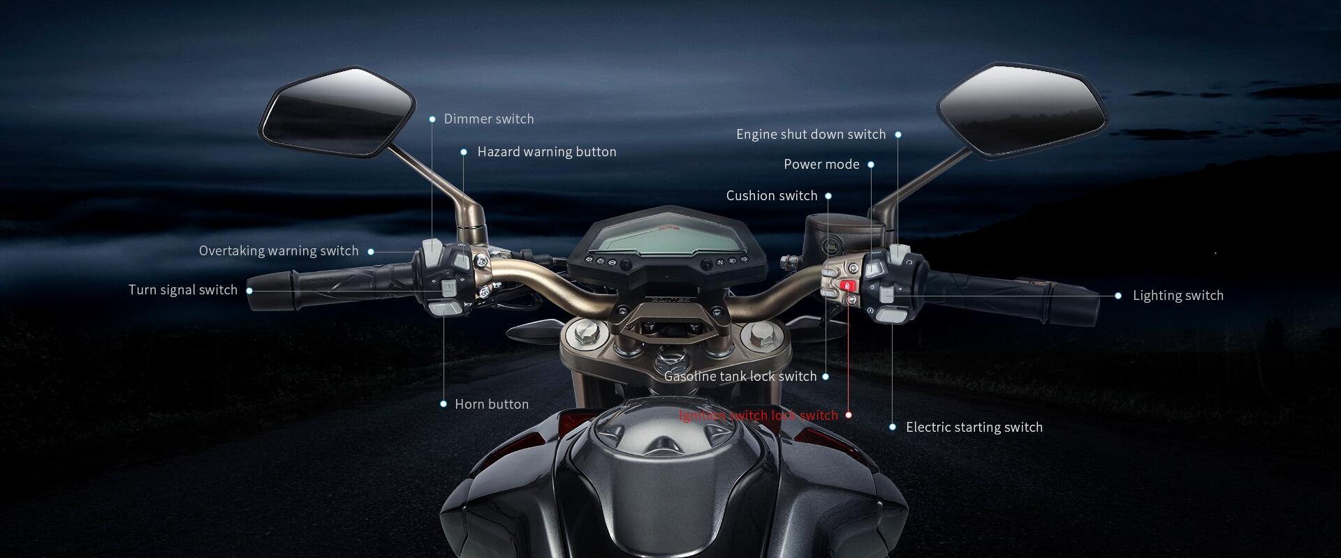 The frame is made of high-strength steel coupled to an aluminum alloy swingarm. The alloy wheels are 17-inch with hollow interior, and house knobby tires 110 / 70-17 at the front and 130 / 70-17 at the rear.