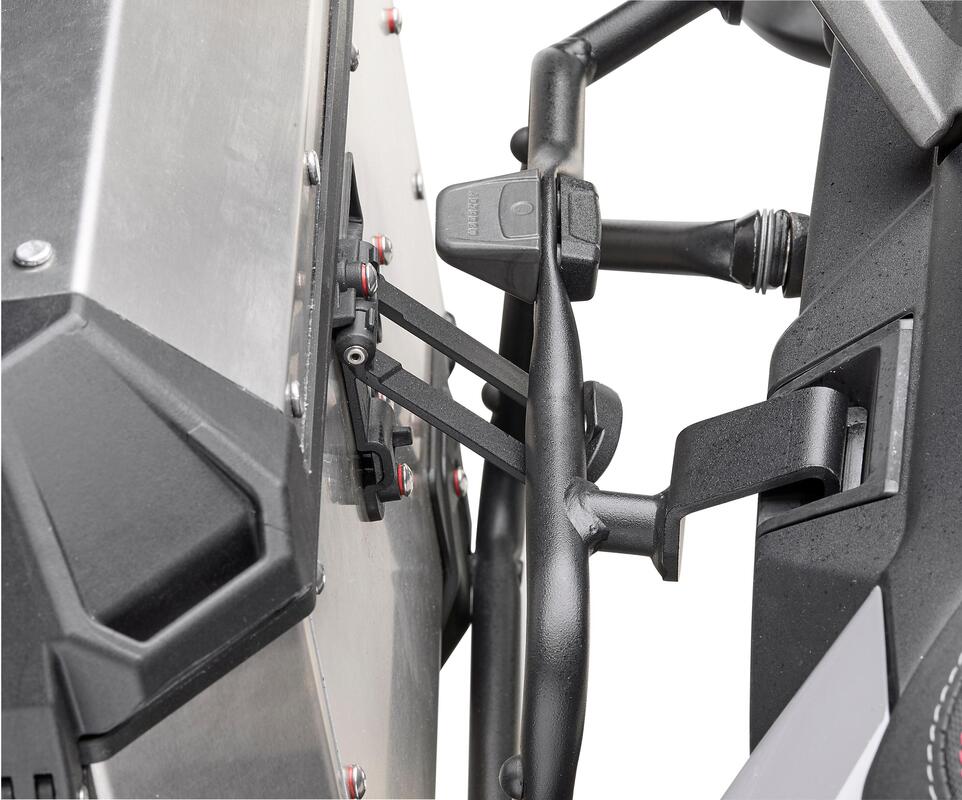 - Alla facilità di carico concorrono la totale apertura del coperchio, rallentata senza l’impiego di cinghie o cavi di ritenuta, e l’inedito sistema meccanico a uncino (patent pending) che consente di inclinare la valigia senza sganciarla dal telaio di supporto.
